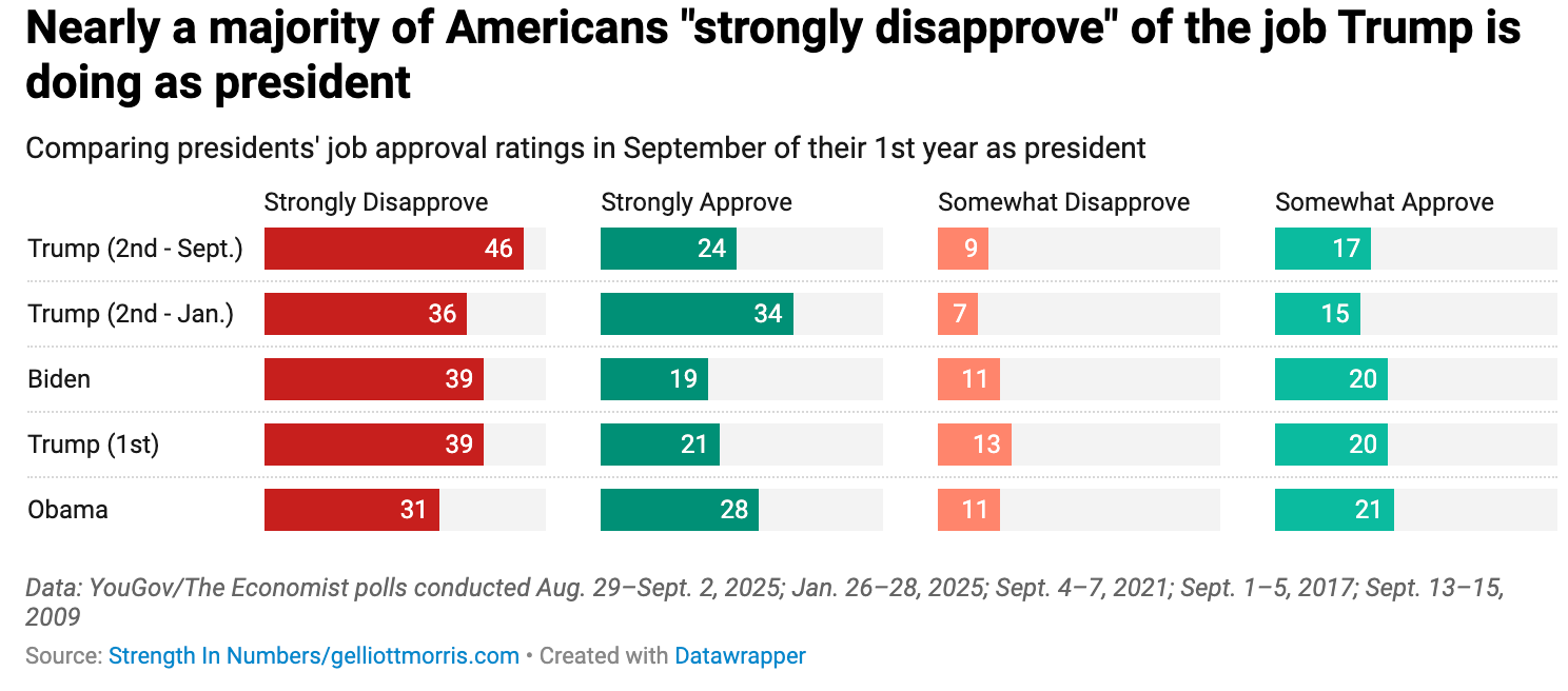 OK, this was in New York, not exactly MAGA country, but it wasn’t that much of an outlier. As G. Elliott Morris points out in Strength in Numbers, what stands out in Trump’s polling isn’t just that a majority of Americans disapprove of Trump, but that almost half the country strongly disapproves:
