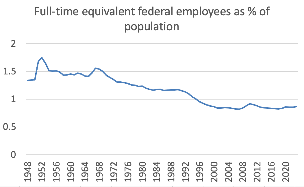 Yet Reagan’s rant came after AFDC enrollment grew rapidly in the 1960s and 1970s. In contrast, Musk’s vendetta has been launched against a federal work force that has been more or less flat for many decades, and has declined drastically relative to the size of the population it serves: