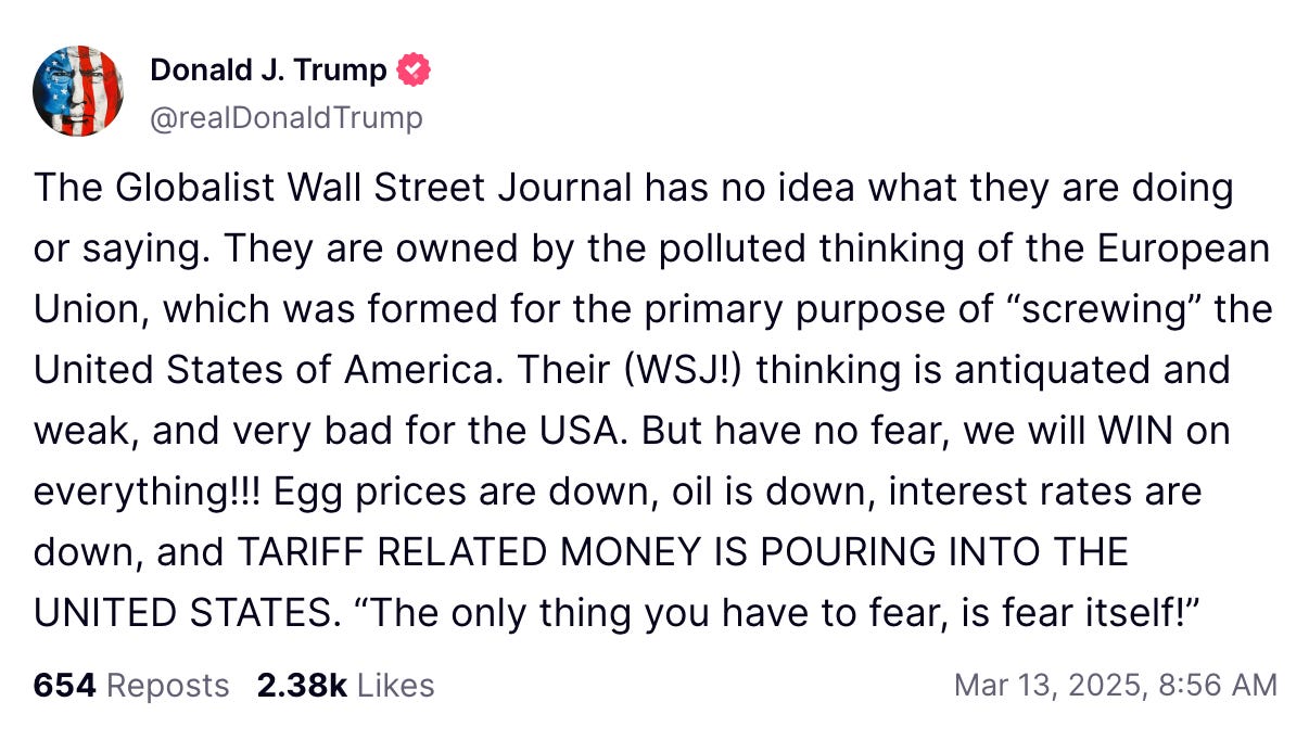 For one thing, it’s awkward to center your economic messaging on claims that Americans need to suffer for President Biden’s (imaginary) sins when Trump’s message throughout the campaign was that he would fix everything on Day One. It’s also remarkable, if you think about it, that Trump officials are in effect offering excuses for a recession that hasn’t happened yet and is at this point only a possibility.