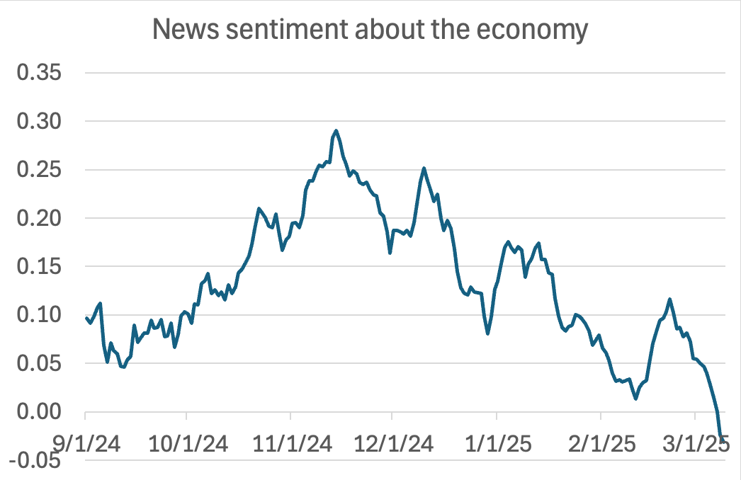 And based on what happened during Trump’s first term, I expected many people to lap it up, at least for a while. I expected stocks to rise on the prospect of tax cuts and deregulation; I expected consumer confidence to rise because Republican views of the economy are largely shaped by partisanship (this is true for Democrats too, but to a lesser extent); I expected media coverage of the economy to turn more positive, with right-wing editorial pages and opinion writers in particular lavishing praise on the new administration.