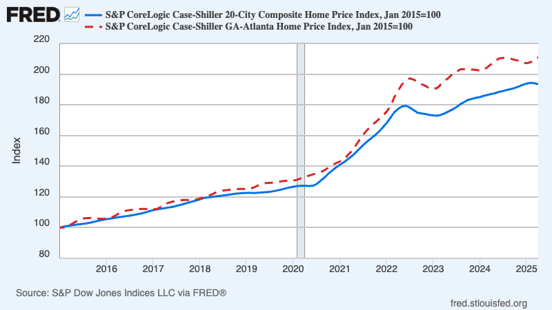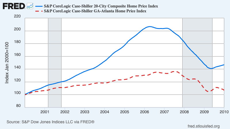 Indeed, Atlanta was basically insulated from the 2000s housing price bubble, and suffered only a modest price decline in the aftermath of the financial crisis that occurred after that bubble burst: