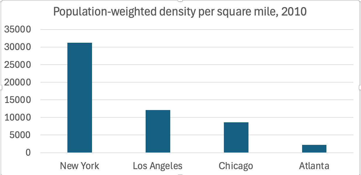 My preferred measure is “population-weighted density,” which asks how densely populated a neighborhood — strictly speaking a Census tract — the average person lives in. The Census calculated this measure after the 2010 Census, but unfortunately doesn’t seem to have continued the practice or even maintained the data on its website. But I was able to retrieve it using the Wayback Machine. And the 2010 data showed New York in a class of its own, even among our biggest cities, while Atlanta was the Sultan of Sprawl: