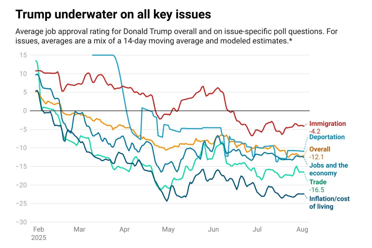 All of this takes place against a political background in which Trump faces massive public disapproval, not just overall but on every issue: