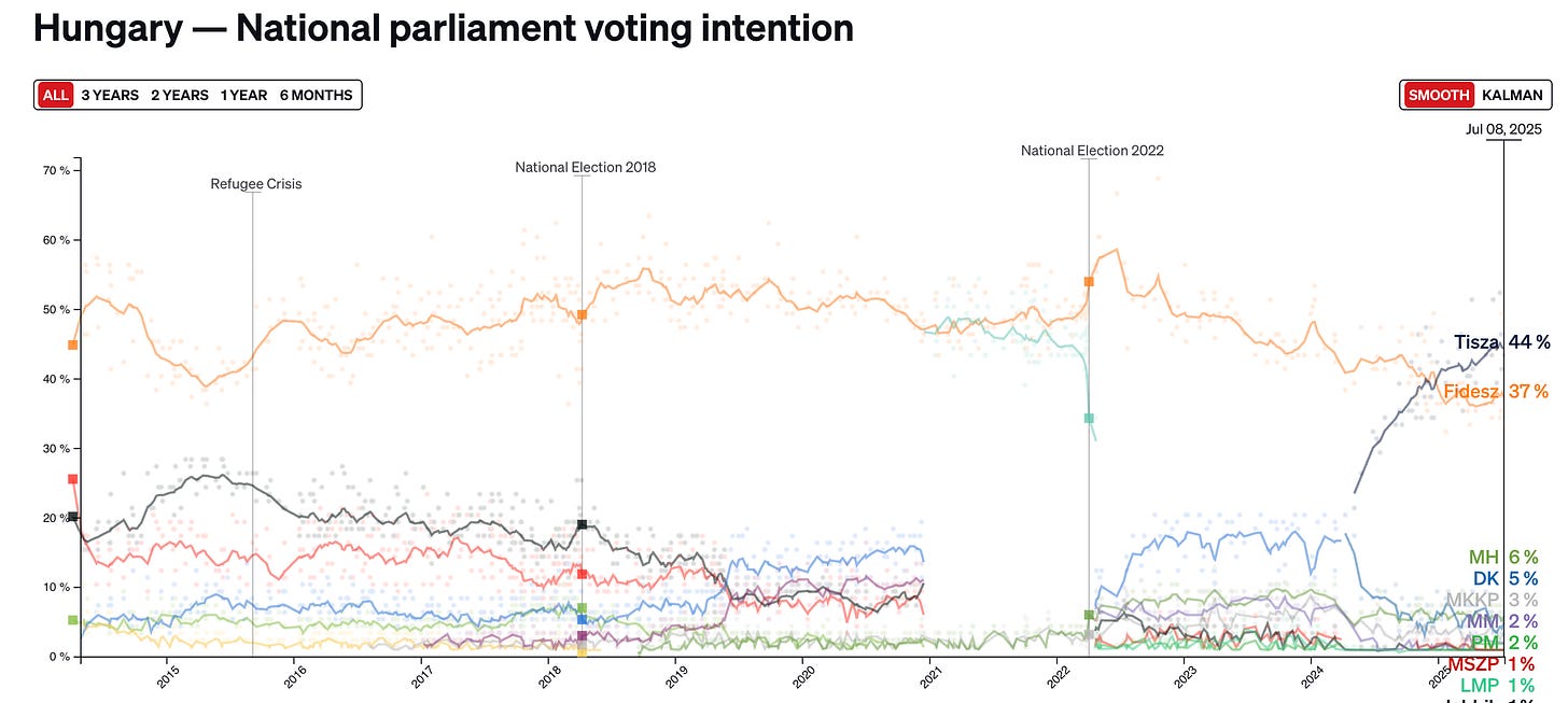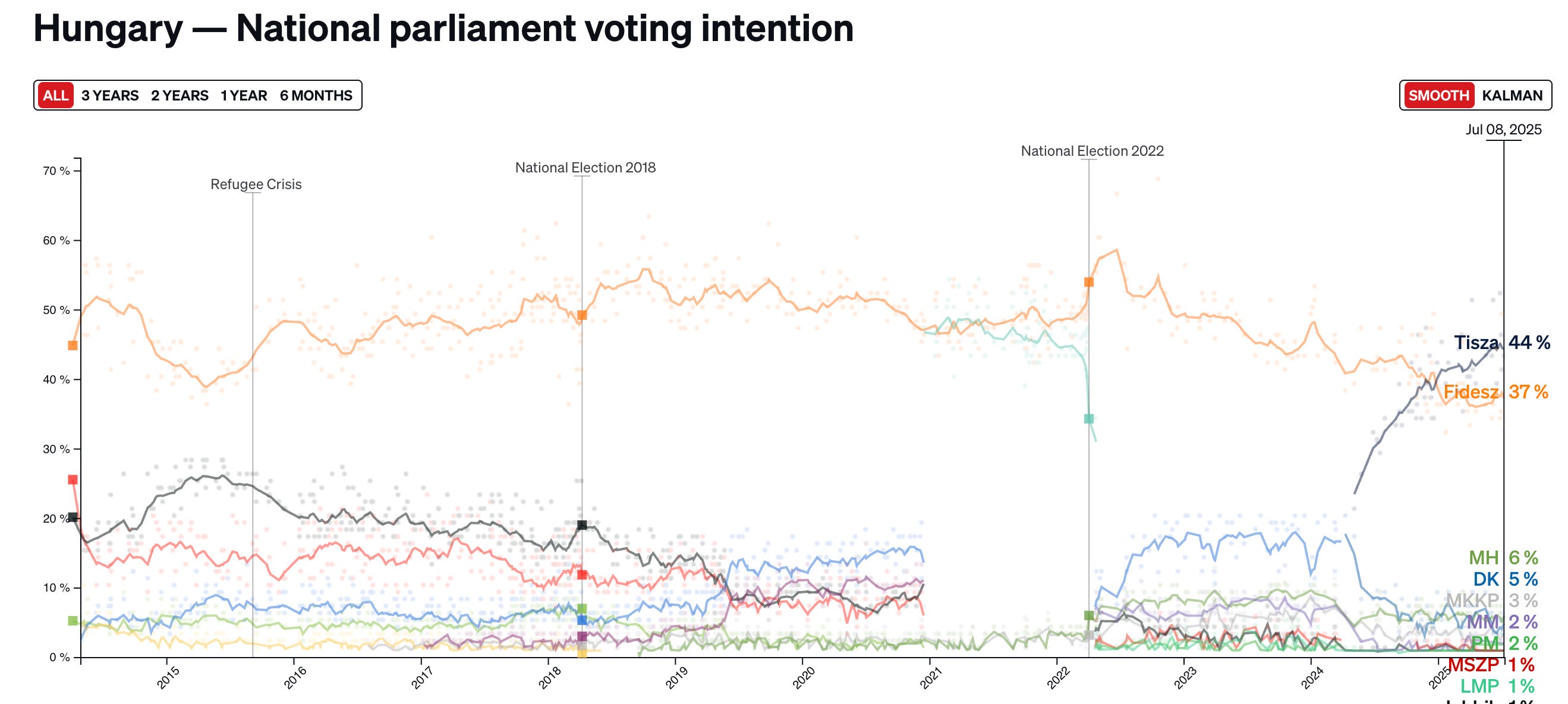 Why did Orban take a gradualist approach to destroying democracy? Partly, no doubt, because too overt a power grab might finally have roused the rest of the European Union from its slumber. But it’s also true that Fidesz had the luxury of time because until recently the party remained quite popular with the Hungarian public: