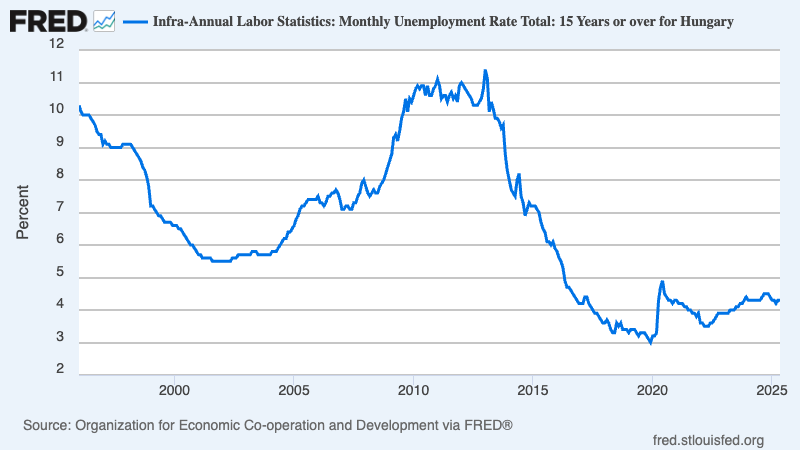 Some of this popularity may have resulted from Fidesz’s takeover of the news media. But it was also true that for a long time Orban could claim to have made Hungary prosperous. He took power at a time of extremely high unemployment: Hungary, like much of the European periphery, was caught up in the disastrous slump caused by Europe’s debt panic. And he was able to preside over a large fall in unemployment as austerity was relaxed: