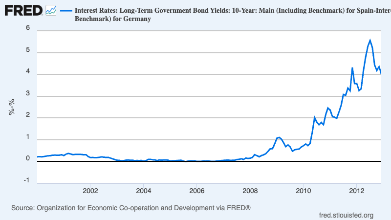Yet the spread between interest rates on Spanish and German bonds — a measure of the risk markets perceived that Spain would experience a crisis — stayed very low until the crisis was already underway: