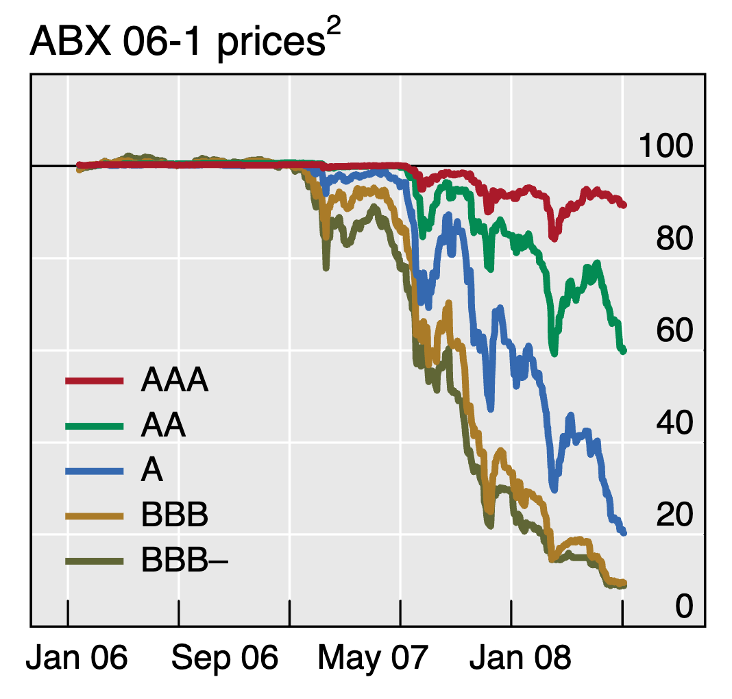 Yet ABX indices, a measure of perceived default risk on securities backed by subprime mortgages, didn’t show any serious decline until well into 2007, when the housing bubble had already been deflating for more than a year:
