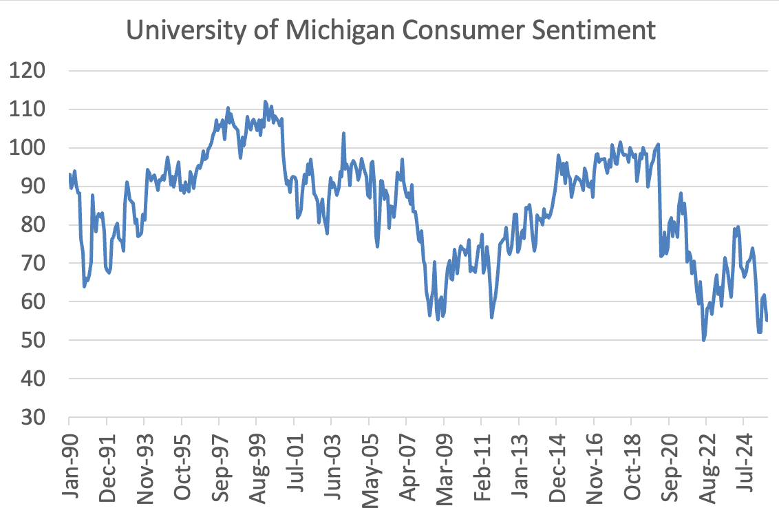 You can see the difference in how people feel about the economy by looking at consumer sentiment, which was very high at the end of the 1990s but is now about where it was during the depths of the global financial crisis: