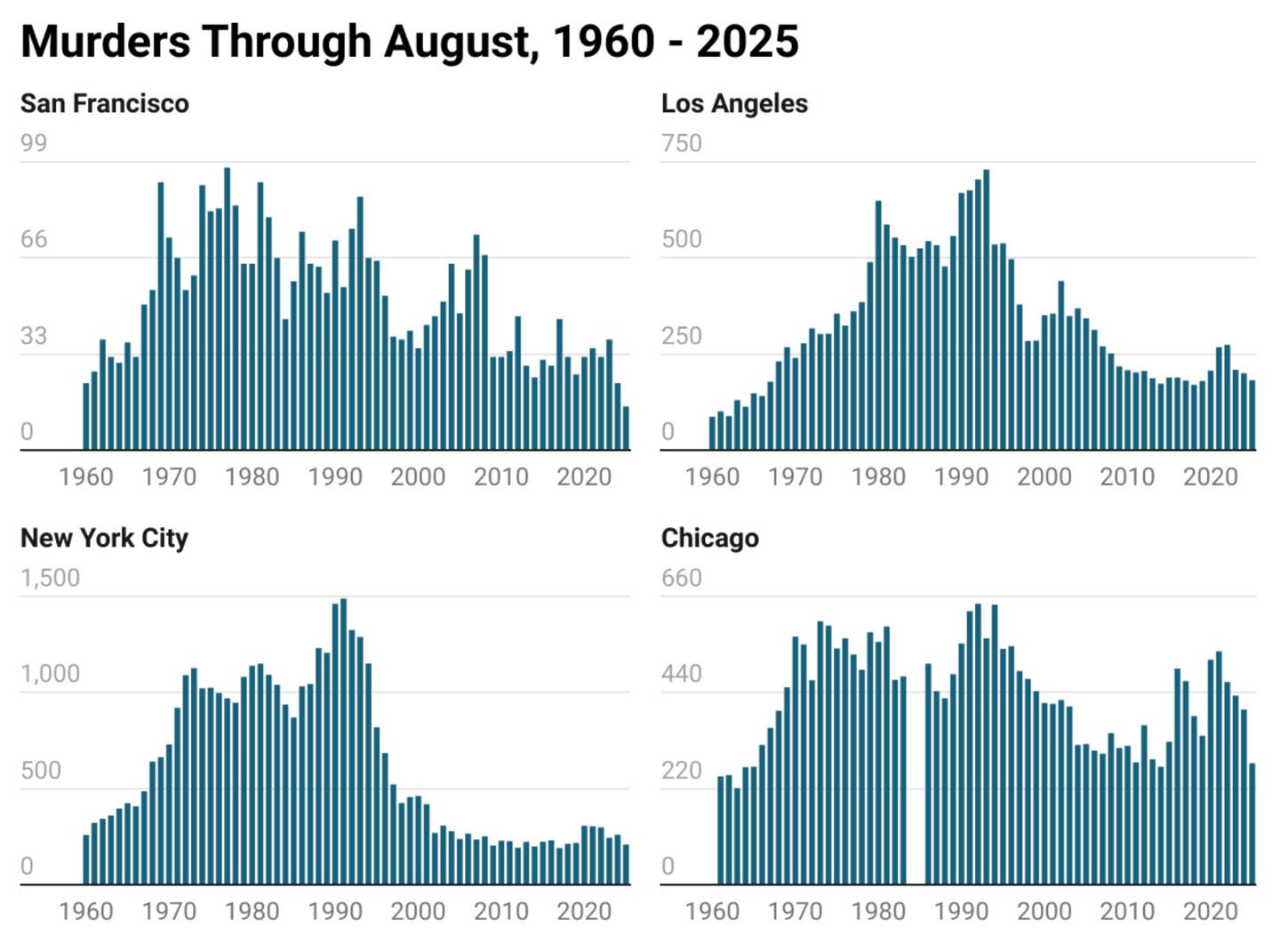 I often make fun of right-wingers who insist that our major cities are all crime-ridden hellscapes (although this delusion has gotten less funny now that the Trump administration is using it as a justification for effectively invading Los Angeles, Washington and soon, reportedly, Chicago.) But 30 or 35 years ago big cities were a lot closer to that dystopian vision than they are now. Jeff Asher recently posted a chart of murder rates through August in several major cities going back to 1960: